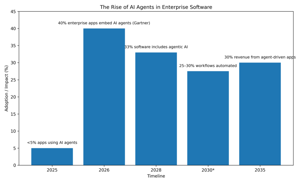 Industry analysts expect these developments to ripple across the enterprise software economy. Some projections suggest that agent-driven services could account for roughly 30% of enterprise software revenue by the mid-2030s.