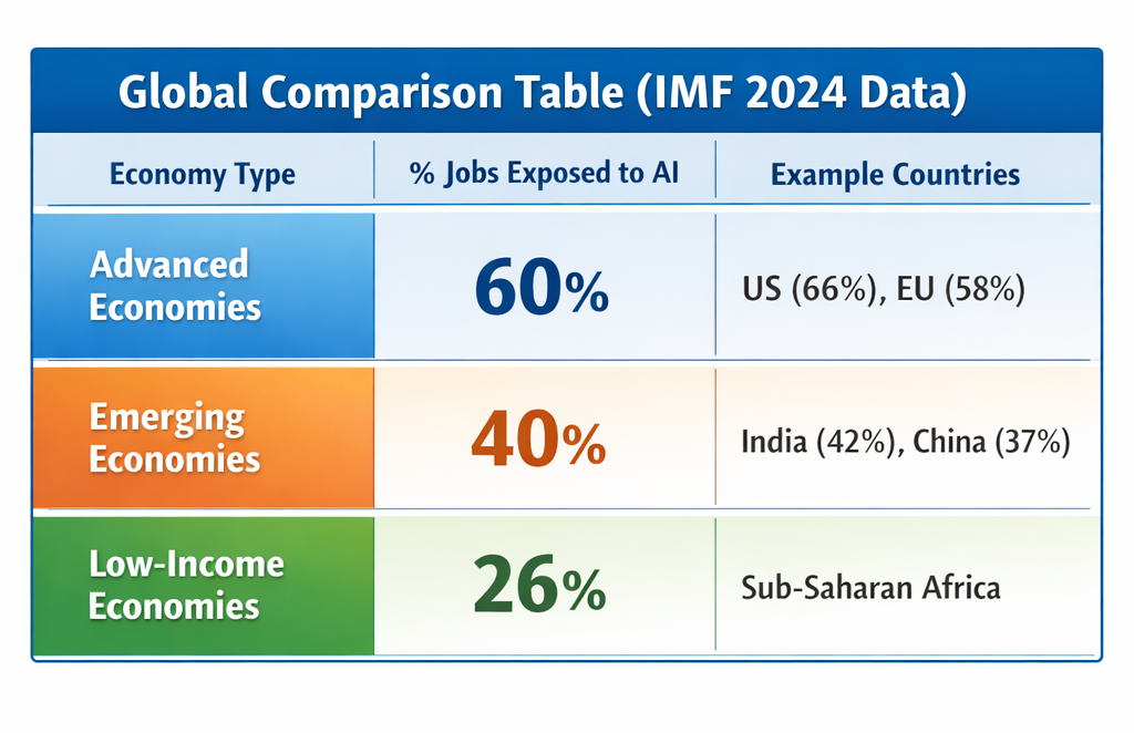 The International Monetary Fund (IMF, 2024) estimates 40% of global employment is exposed to AI, rising to 60% in advanced economies (e.g., US, EU) and 40% in emerging markets (e.g., India, China). Low-income countries face ~26% exposure but higher vulnerability due to weaker safety nets.