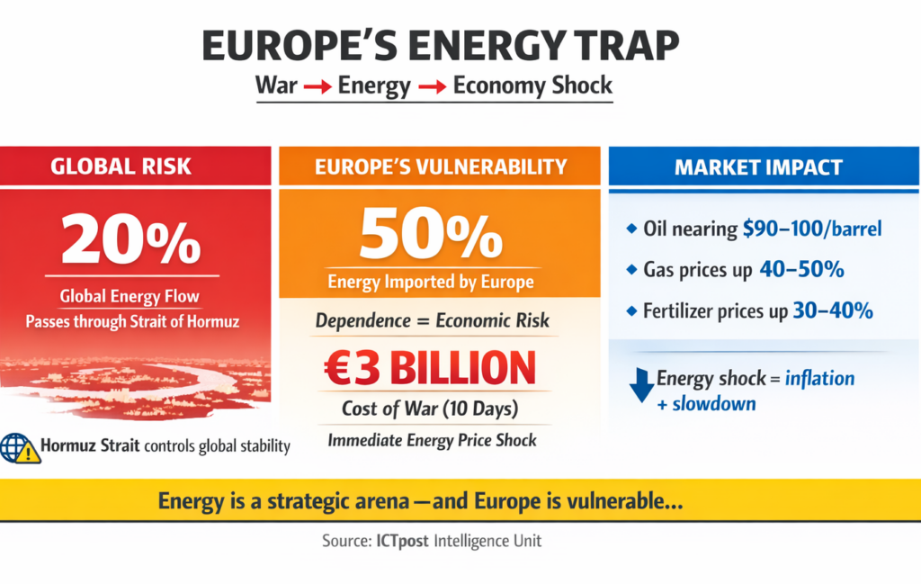 The escalation of conflict involving Iran has pushed energy back to the centre of Europe’s economic vulnerability, reigniting fears of inflation, disrupted growth and renewed pressure on the euro. The trigger is familiar: geopolitics colliding with energy supply. This time, the fault line runs through the Middle East.